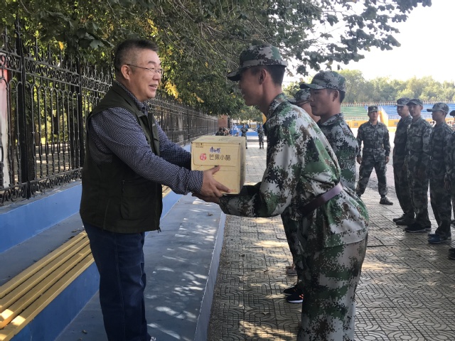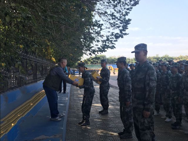 经过教官的整队,新生神采奕奕地站在了院领导的面前,他们一个个精神抖擞、身姿挺拔。慰问开始后,王院长代表学院表达了对新生们的关心和祝福,赞扬了新生们在军训中所展现出的坚韧不拔的优良品质。他谈到自己在上学时没有军训这一课,为此表示遗憾,希望同学们能好好珍惜军训时光,圆自己一个军人梦。王院长的一番话极大地鼓舞了同学们,大家纷纷表示一定会严格训练,积极准备,争取圆满完成军训任务。随后,王院长分别给四位教官和五位班级代表开始分发慰问品,此时军训场上充满了温暖的笑容,善意的祝福,羞涩的感谢和热烈的掌声。