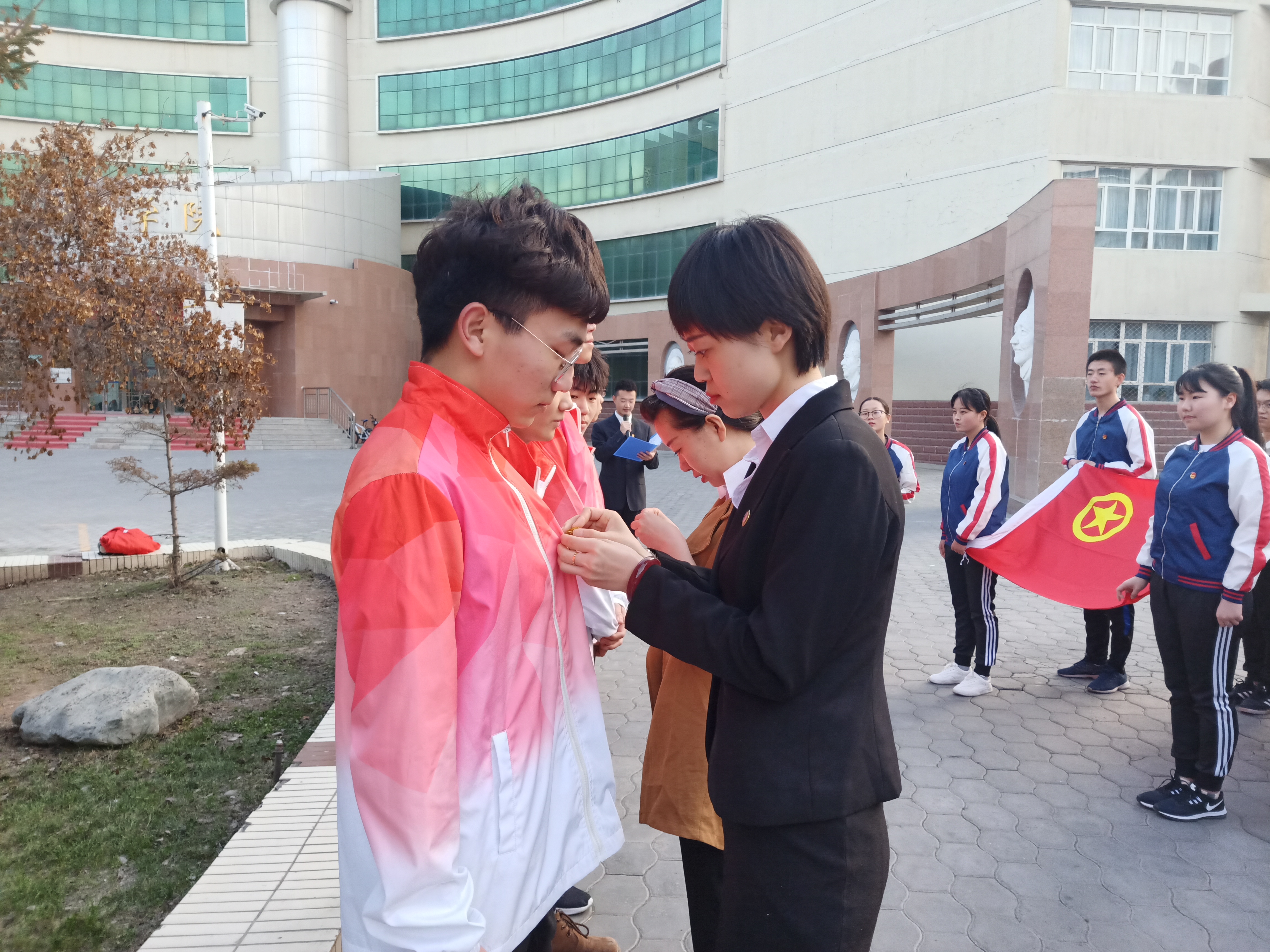 赖娇老师和翁琳琳老师为新团员佩戴团徽