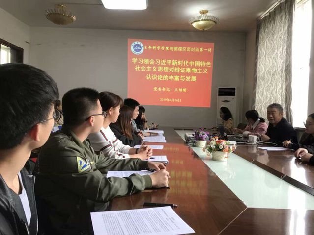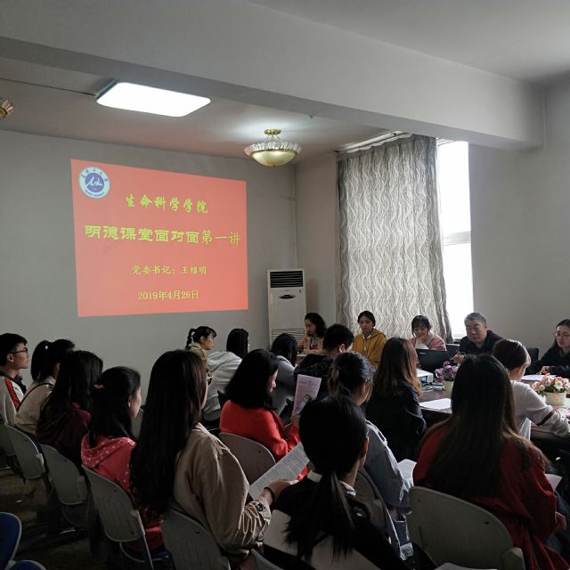 2019年4月26日,生命科学学院党委书记王绍明教授在学院学术报告厅为35名学生党员开讲“明德课堂面对面”第一讲,主题为“学习毛泽东《实践论》,深刻领会习近平新时代中国特色主义思想对辩证唯物主义认识论的丰富和发展。”