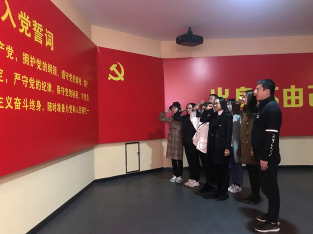 在展厅内,全体党员面向党旗,重温入党誓词,铭记党员初心使命,坚定不断前行的理想信念。