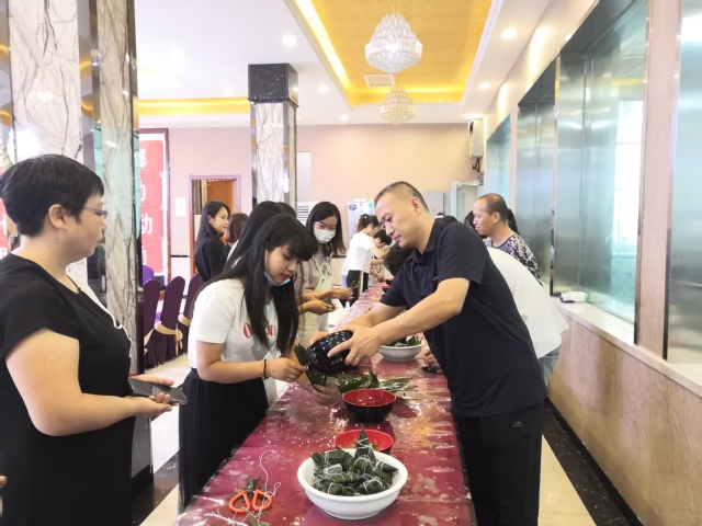 活动现场,首先进行了包粽子环节。包粽子环节可谓是最有趣的环节了。“同学们,先将粽叶卷成漏斗状,将糯米放入漏斗内,把上面的叶子将糯米盖好。用粽叶围绕粽身绕一下,紧紧包裹起来,再用绳将粽子捆起来即可。”在包粽子的现场,一名教师一边示范,一边向学生讲解包粽子的方法、步骤及注意事项。老师和同学们在学包粽子时全神贯注,认真学习包粽子技术,卷粽叶、装糯米、包粽子、捆粽子……每个环节都做得有模有样。还有的学生两人一起合作包粽子,一个双手捧着包成三角形的粽子,一个拿着扎粽子的绳子在粽身上缠绕,两个人合作了很久才包好了这个粽子。包出来的粽子也各有千秋,但是每个人的脸上却洋溢着笑容。整个活动现场弥漫着端午粽香的味道,现场所有人尽情地享受着节日的快乐。