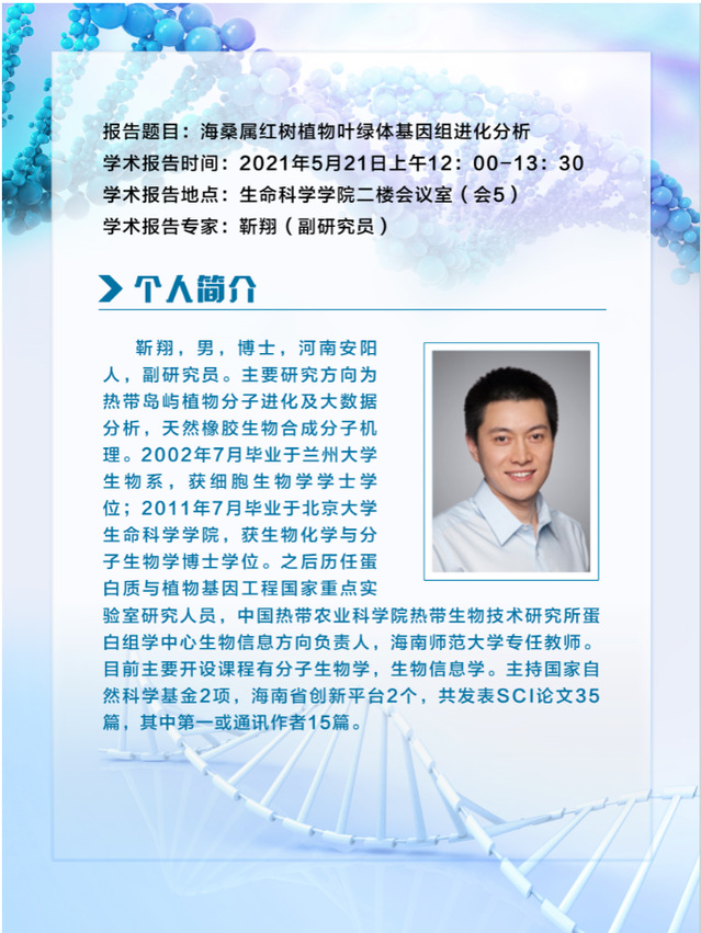 21日上午,靳翔副研究员为我院师生带来一场题为“海桑属红树植物叶绿体基因组进化分析”的学术报告,靳老师从海桑属植物简介、叶绿体基因组的序列分析、叶绿体基因组系统发育分析及转录组分析等内容进行了报告和详细解答,现场师生积极与靳老师深入交流,收获颇丰。会后又与新葡的京官网领导以及相关教师进行科学研究合作、人才培养等方面进行了面对面交流与洽谈。