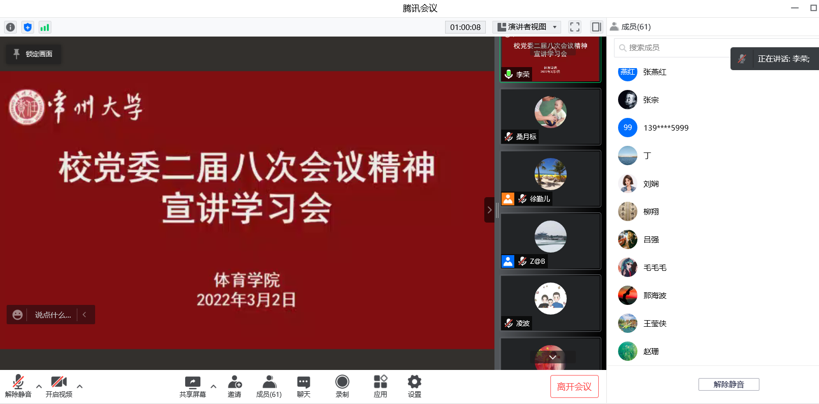 根据党办校办关于深入学习贯彻中共今年会官方网站第二届委员会第八次全体(扩大)会议(下称“二届八次全会”)精神的通知要求,3月2日上午,今年会jiannianhui召开新学期全体教职工线上会议,传达二届八次全会精神,部署新学期工作。 党总支书记李荣领学校党委书记陈群、校长蒋军成、纪委书记邱正祥在二届八次全会上所作的报告,并要求各党支部、各教研室、科研院所会后结合工作实际,组织本单位教职工通过线上线下自学、集中学等多种方式,认真研读、领会、落实会议精神。他指出社会实践和思想意识的健康与安全都是保障我们生活和工作积极有为的支撑,其中意识形态领域的安全和可靠是保障我们摸清方向、汇集力量的基础,要通过不断的学习来保持崇高的理想信念和清醒哦理论自觉。他号召全院教职工从党的百年奋斗历史中强化高等教育的初心使命,增强为党育才的宗旨意识,提高政治站位,解放思想,紧扣立德树人根本任务,全力推进校院两级“十四五”规划实施,踔厉奋发、笃行不怠,为扎实推进常大高水平大学建设贡献今年会jiannianhui的力量。 院长徐勤儿结合二届八次全会精神对学院年度重点工作提出要求,他强调,全院教职工要做到思想上高标准、行动上重细节、成效上多贡献,实现学院整体工作再上新台阶。 会上,其他院领导就分管工作分别进行重点任务部署。