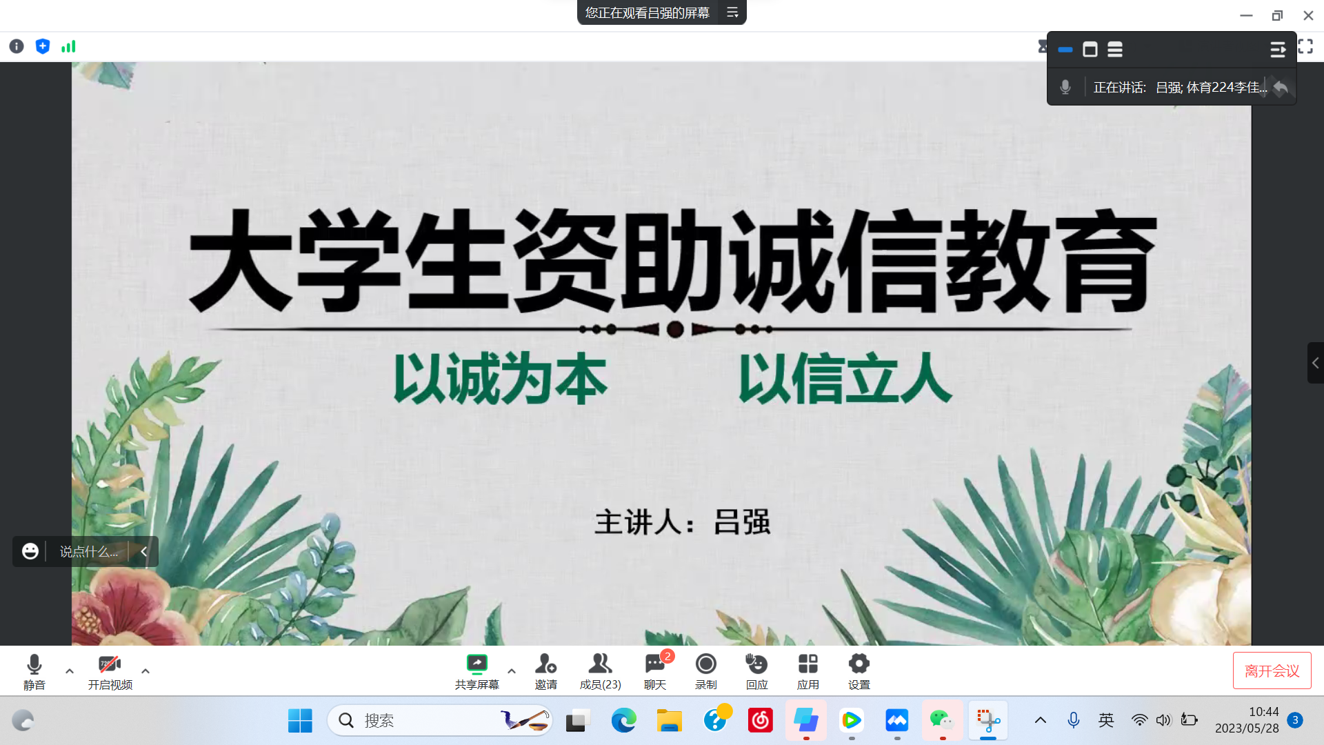 为深入贯彻落实党的二十大精神,巩固和深化诚信教育成果,充分发挥资助育人效果,紧紧围绕立德树人根本任务,坚持把促进家庭经济困难学生成长成才作为学生资助工作的出发点和落脚点。5月28上午10:30,今年会线上开展资助诚信教育主题讲座。辅导员吕强、国家励志奖学金以及国家助学金部分受助学生参加了本次讲座