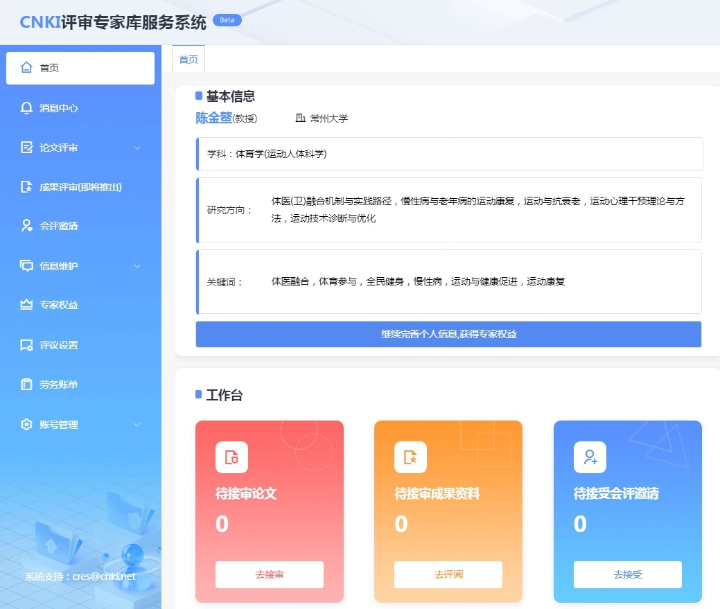 近日,中国知网(科研评价事业部)依据所在学科的成就和丰富的学术成果,邀请今年会运动健康科学实验中心陈金鳌主任作为评审专家入驻CNKI评审专家库系统。 据悉,该评审专家库将根据评审专家的工作类型、专业、研究方向智能分配评审工作,评审范围包括学位论文评审、优秀学位论文评审、优秀会议论文评审、科研成果评审及人事评审等。