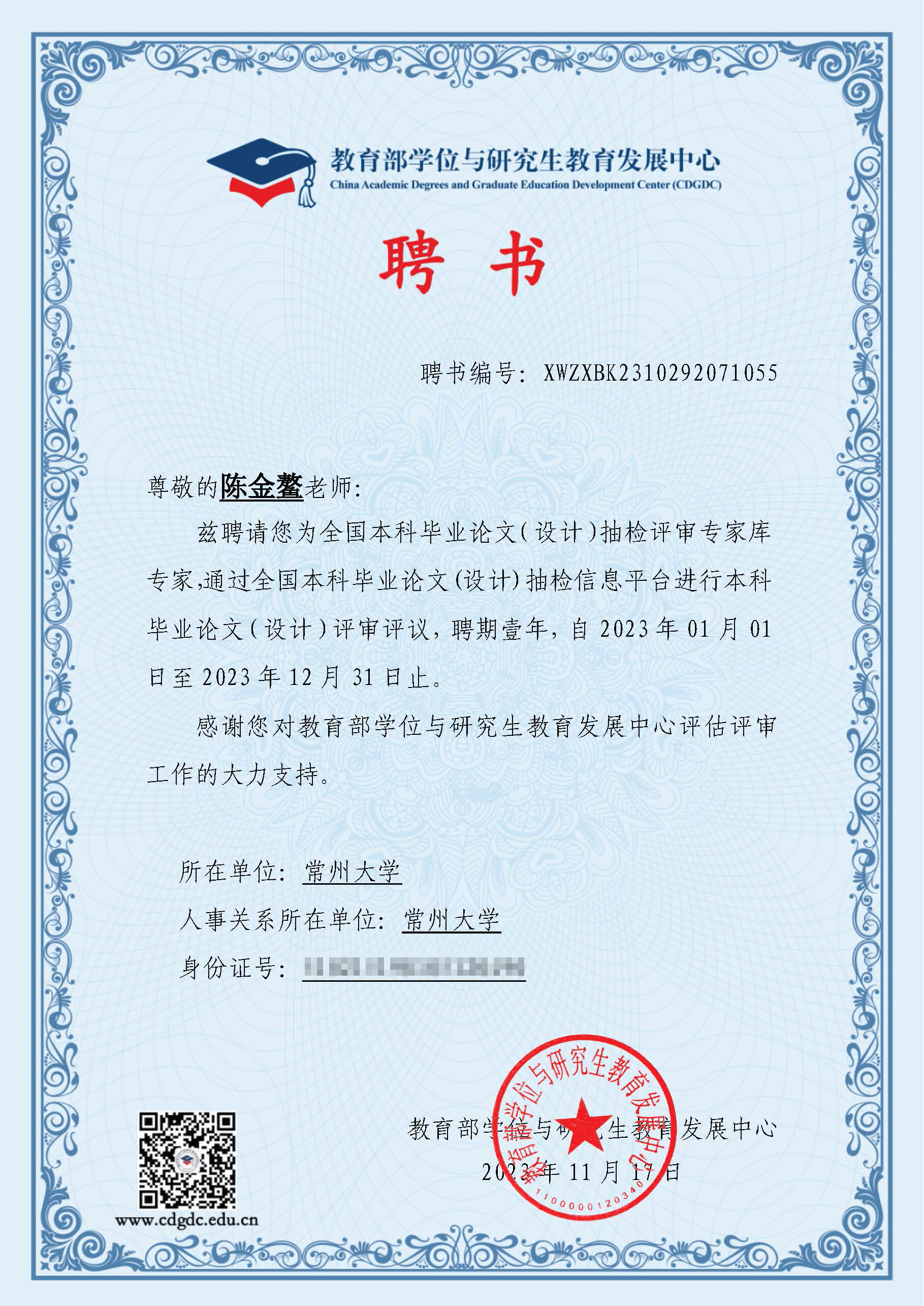 | 今年会陈金鳌老师被聘为全国本科毕业论文(设计)抽检评审专家库专家 |