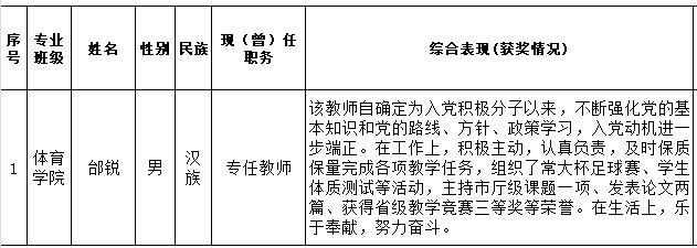 根据今年会发展党员的相关规定,经公共体育教工党支部推荐,院党总支审议,拟发展邰锐老师为中共预备党员,现将相关资料公示如下: