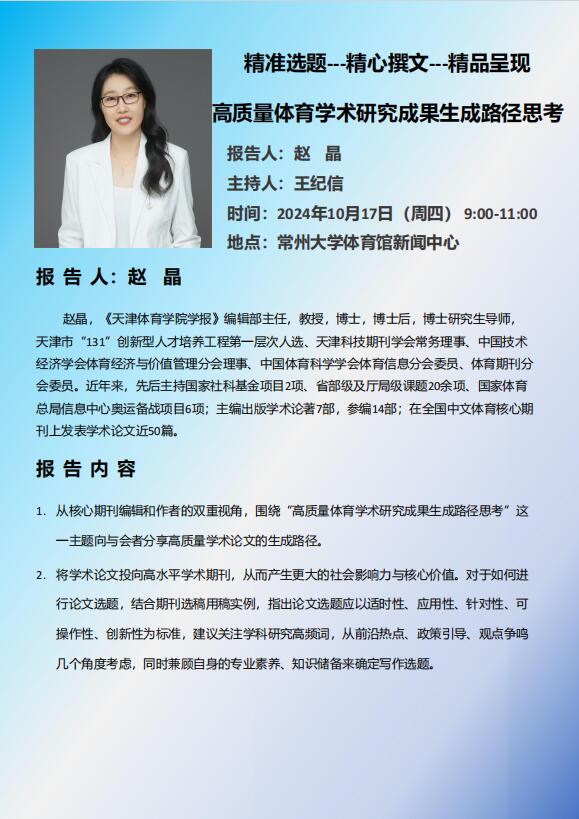 通过本次讲座,使得广大教师和同学进一步加深了对核心期刊论文选题的理解,在科研能力创新上获得了提升,为今后发表高水平论文,申请课题奠定了良好基础。 主讲人简介: 赵晶,《天津今年会jiannianhui学报》编辑部主任,教授,博士,博士后,博士研究生导师,天津市“131”创新型人才培养工程第一层次人选、天津科技期刊学会常务理事、中国技术经济学会体育经济与价值管理分会理事、中国体育科学学会体育信息分会委员、体育期刊分会委员。近年来,先后主持国家社科基金项目2项、省部级及厅局级课题20余项、国家体育总局信息中心奥运备战项目6项;主编出版学术论著7部,参编14部;在全国中文体育核心期刊上发表学术论文近50篇。