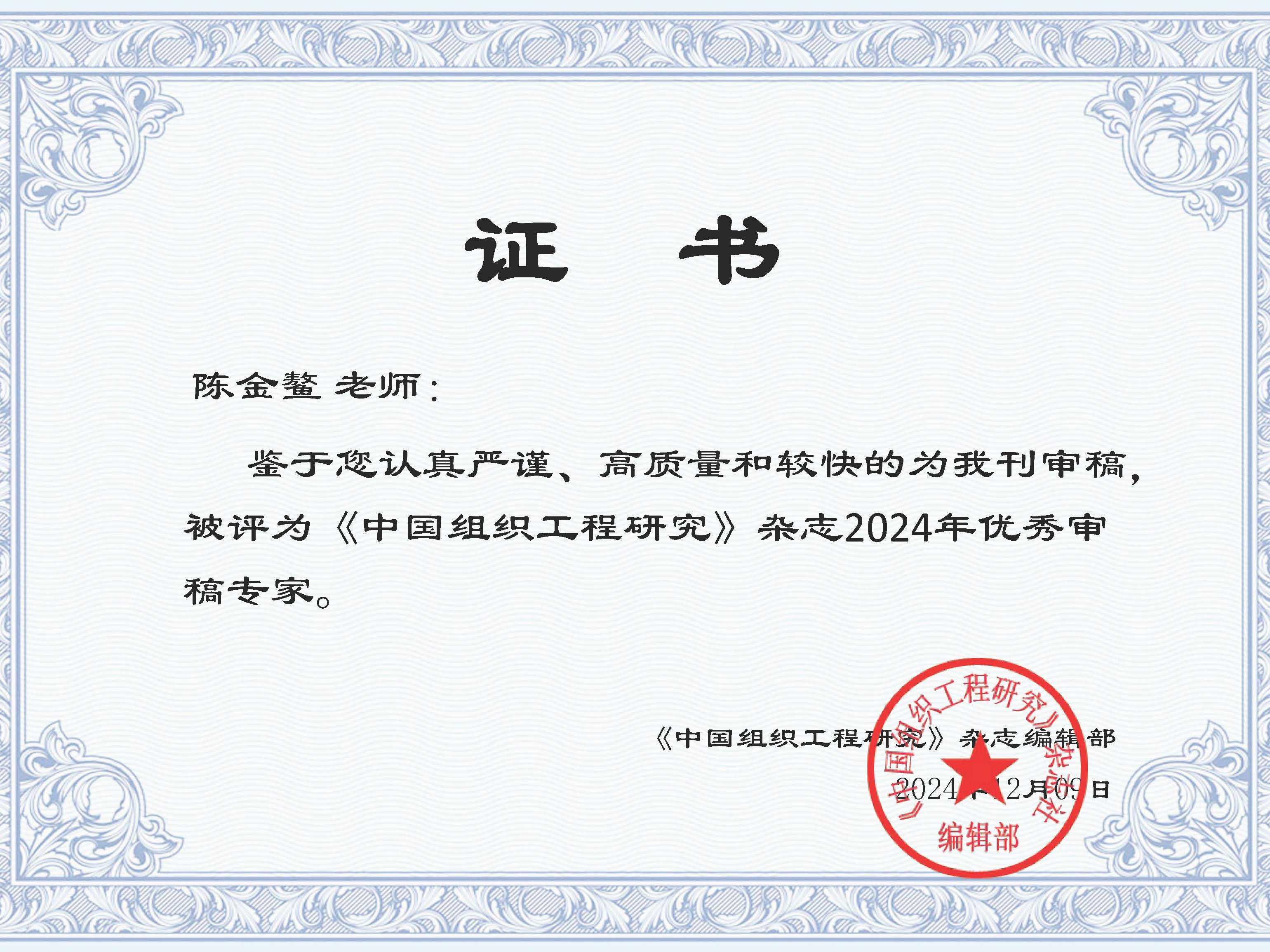| 今年会教师陈金鳌被双核心期刊《中国组织工程研究》杂志评为 2024年优秀审稿专家 |