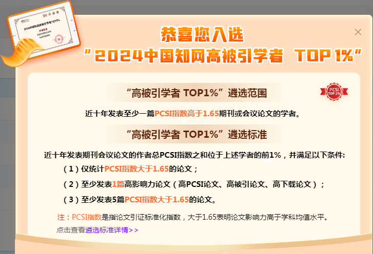 中国知网中国科学文献计量评价研究中心(简称“知网评价中心”)基于中国知网收录的国内学术期刊论文和会议论文,2024年首次开展学者学术影响力客观评价,遴选了“2024中国知网高被引学者”名单,助力优秀成果的国内首发。“中国知网高被引学者”遴选活动旨在客观、科学衡量并表彰近十年来国内科研成果丰富、学术影响力杰出的学者群体。 本次发布的“2024中国知网高被引学者”评选体系是对前期“知网最具/高影响力学者”评选标准的优化升级。经过定量数据统计、遴选方案评审、学科专家调研等前期筹备工作,现已初步形成“2024中国知网高被引学者”名单并在网上预发布。“2024中国知网高被引学者”采用的评价指标为作者发表论文的加权总PCSI。选取论文的条件是该论文的PCSI需高于理论平均值,权重与合作作者数量以及作者署名顺序相关。PCSI是论文引证标准化指数(Paper Citation Standardized Index),是知网为了实现论文跨学科跨年可比而对论文被引频次的标准化数值。