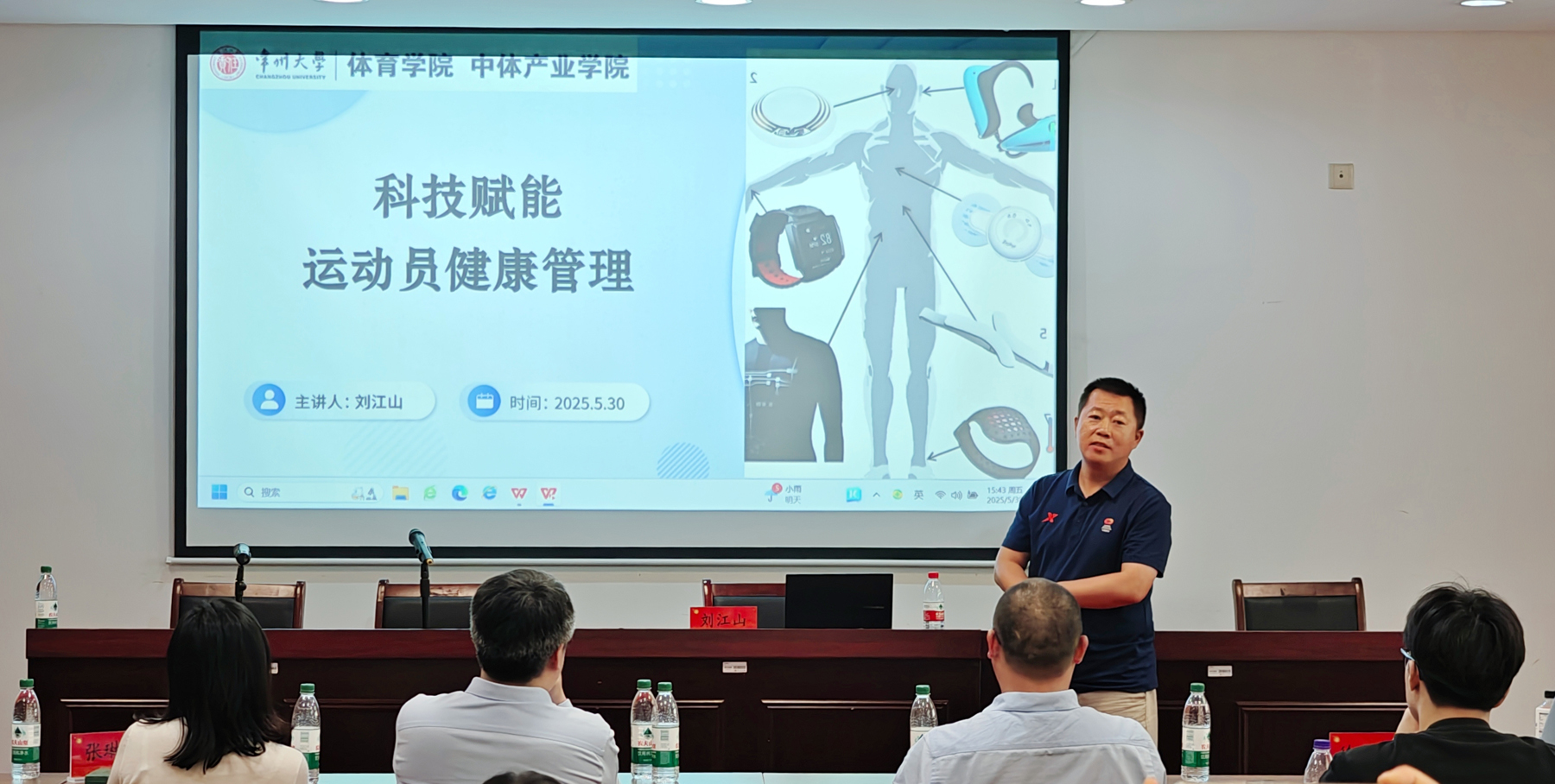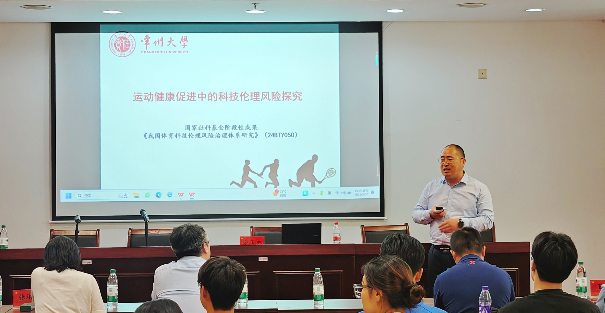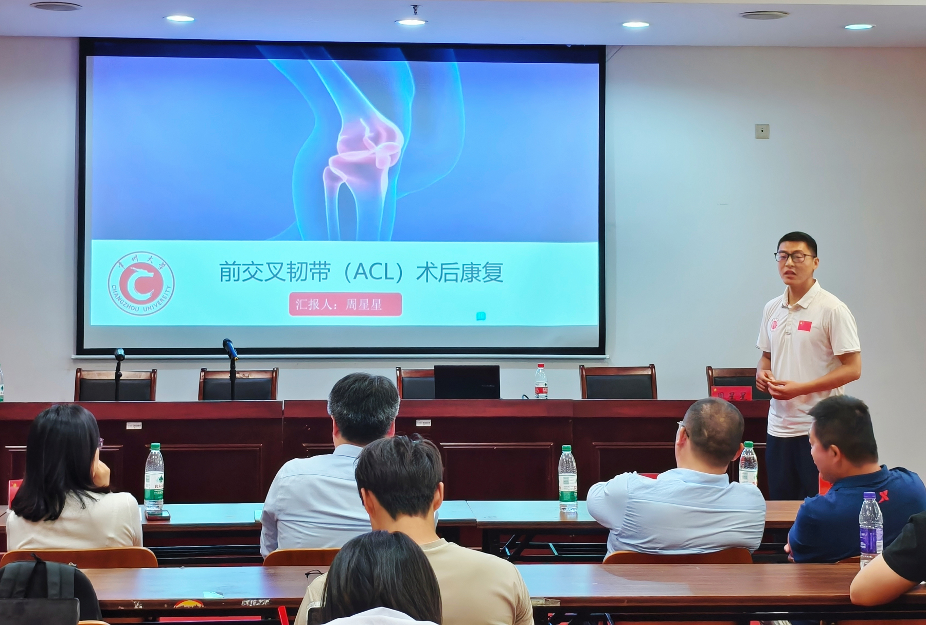 李方晖教授作报告 主报告后,由徐正旭博士、刘江山博士、王濯博士、周星星老师、张华军博士等五位青年教师分别作题为《运动健康促进中的科技伦理风险探究——以劝导技术为例》《科技赋能运动员健康管理》《脑卒中的全生命周期精准化管理研究》《前交叉韧带重建术后康复》《AI大模型助力释放新质生产力》的专题报告,李方晖教授、张琳琳教授与5位青年教师分别进行了跨学科领域的学术交流,对青年教师成长道路上遇到的困难答疑解惑,现场气氛热烈。